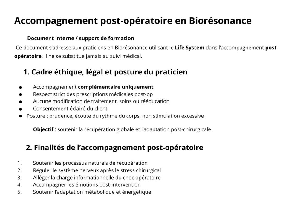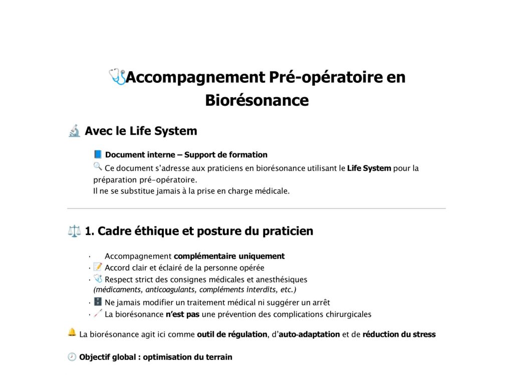 Travaux réalisés par les Lifeurs Du pendule au L.I.F.E.-Systemexercices pour penduler. par Anne-Sophie Sagot Accompagement Post-opératoire en biorésonance avec le L.I.F.E.-System. par Corinne Moriceau Accompagnement Pré-opératoire en biorésonance avec le L.I.F.E.-System. par Corinne Moriceau Le muscle PSOAS en biorésonance par Aline Lecomte Comment analyser et construire ma séanceavec le L.I.F.E.-System. par Corinne Bongioanni Posture du thérapeute avant et après une séance. par Nathalie Szlein Questionnaire bilan santé à destination de vos clients. par Nathalie Szlein Bibliothèque